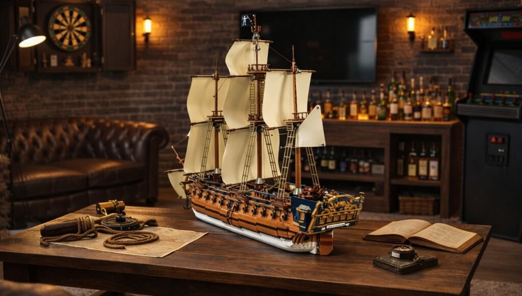 Wat deze set echt interessant maakt, is het volledig uitgewerkte interieur. Veel grote scheepsmodellen focussen vooral op de buitenkant. Hier kun je daadwerkelijk in het schip kijken.