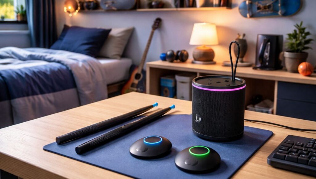 Ook fijn is dat alles compact blijft. Je bergt de drumsticks en pedalen makkelijk op en de speaker past zo in een kast of tas. Vergeleken met elektronische drumstellen die je moet opbouwen en afbreken, is dit een verademing. Zelfs compacte e-drums nemen nog steeds ruimte in beslag en vragen om standaards, kabels en stopcontacten. Dit systeem voelt veel flexibeler en past beter bij een woonkamer waar je niet permanent een muziekinstrument wilt hebben staan.
