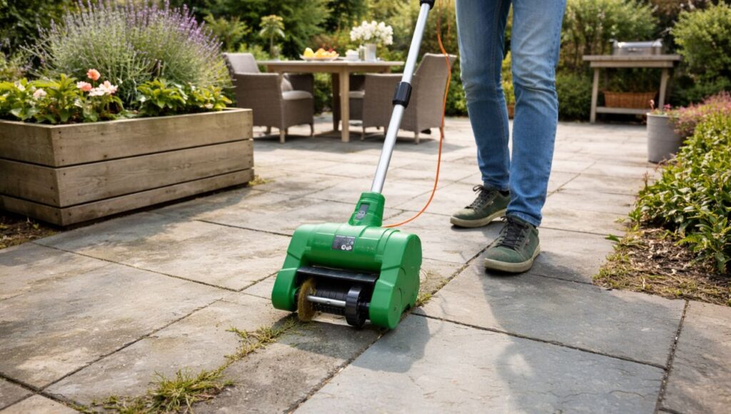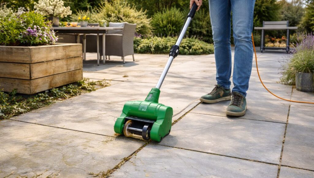 Als je een tuin hebt, dan herken je dit vast: je terras ziet er aan het begin van de lente nog prima uit, en een paar weken later lijkt het alsof er een groen tapijt overheen kruipt. Mos tussen de tegels, van die gladde groene aanslag die je schoenen nét iets te vaak laat glijden, en onkruid dat zich precies op de meest irritante plekken omhoog werkt. En dan heb je nog de “klassiekers”: een harde bezem, een voegenkrabber en een pijnlijke onderrug na twintig minuten.