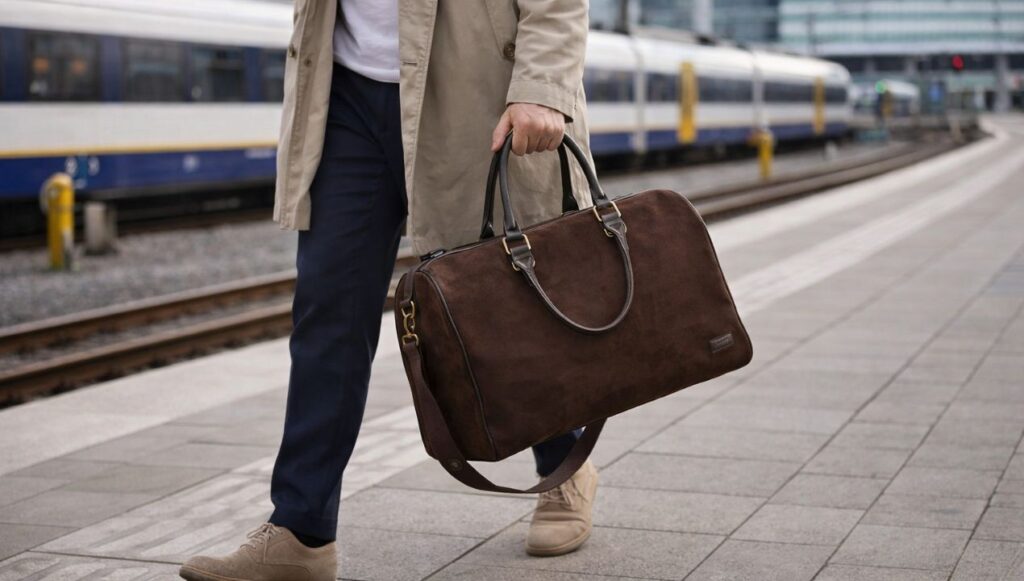 De Hunton weekendtas heeft een buitenkant van suède-imitatieleer en voelt daardoor zachter en “warmer” aan dan een gladde leren tas of een standaard polyester sporttas. Het voordeel van die suède-look is vooral dat het heel snel stijlvol oogt, zelfs als je ‘m gewoon in je hand draagt met een simpele outfit.