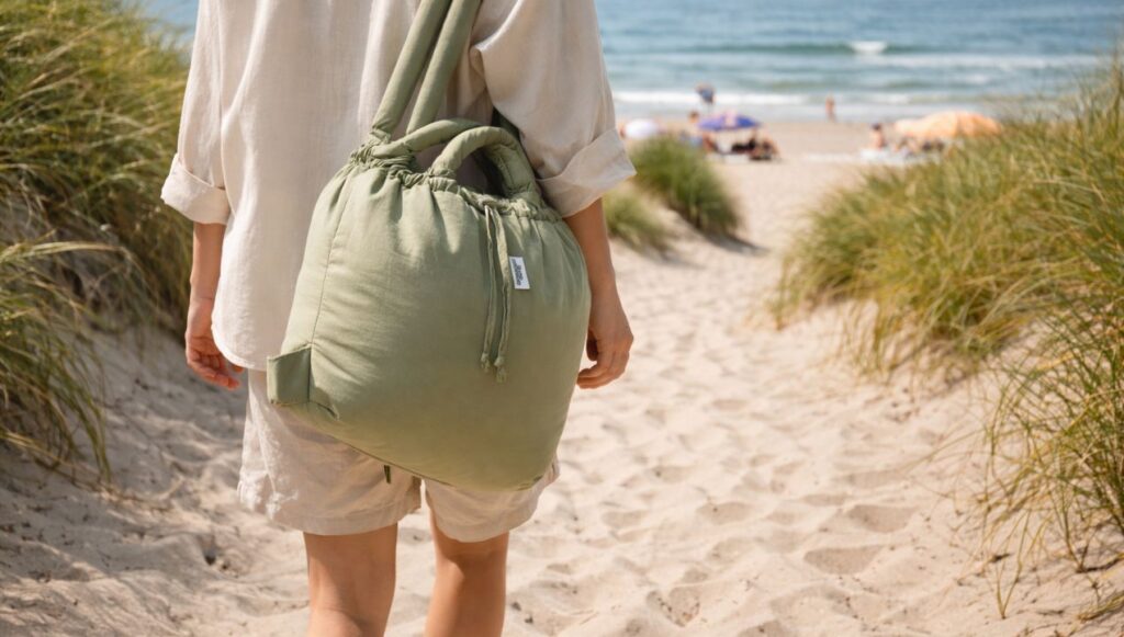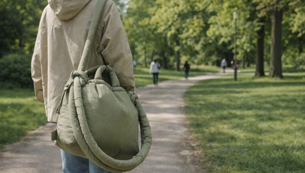 De olijfgroene kleur helpt daar enorm bij. Die tint is rustig, warm en makkelijk te combineren. Of je nu in een zwarte jas loopt, een beige trenchcoat draagt of gewoon in een hoodie en sneakers de stad in gaat, deze kleur past zich aan zonder moeite. Het is geen trendkleur die over een jaar ‘zo 2023’ voelt, maar eentje die blijft werken.