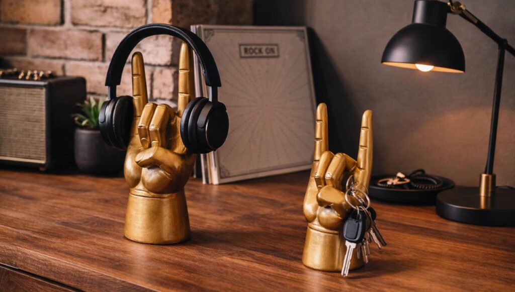 Wat direct opvalt aan de Rock On koptelefoonhouder is het iconische ontwerp. De hand in het bekende rockgebaar trekt meteen de aandacht en geeft elke ruimte een speelse, rebelse uitstraling. In tegenstelling tot standaard koptelefoonhouders die vaak minimalistisch en onopvallend zijn, kiest dit model bewust voor karakter.
