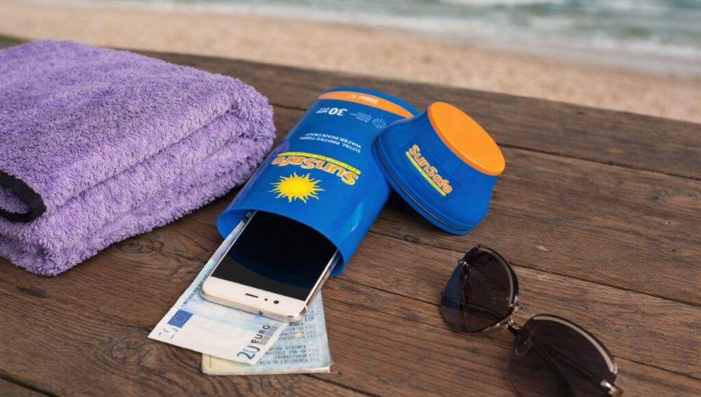 De kracht van de SunSafe is dat het geen typische “value item” is. Een portemonnee ziet eruit als iets waardevols. Een telefoontasje ziet eruit als iets waardevols. Een heuptasje wordt vaak al bij voorbaat als interessant gezien. Maar een fles zonnebrand? Daar kijkt niemand naar.