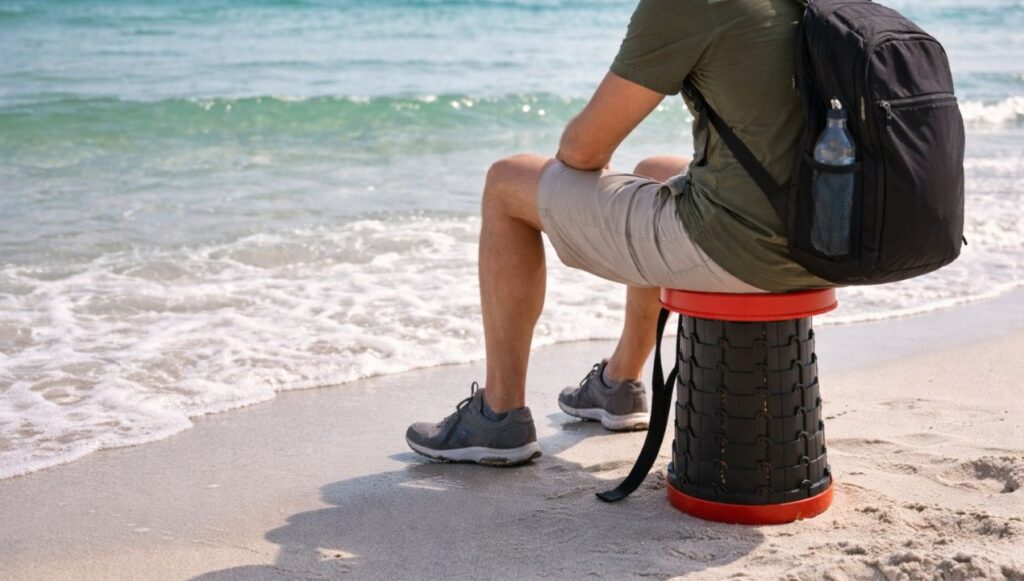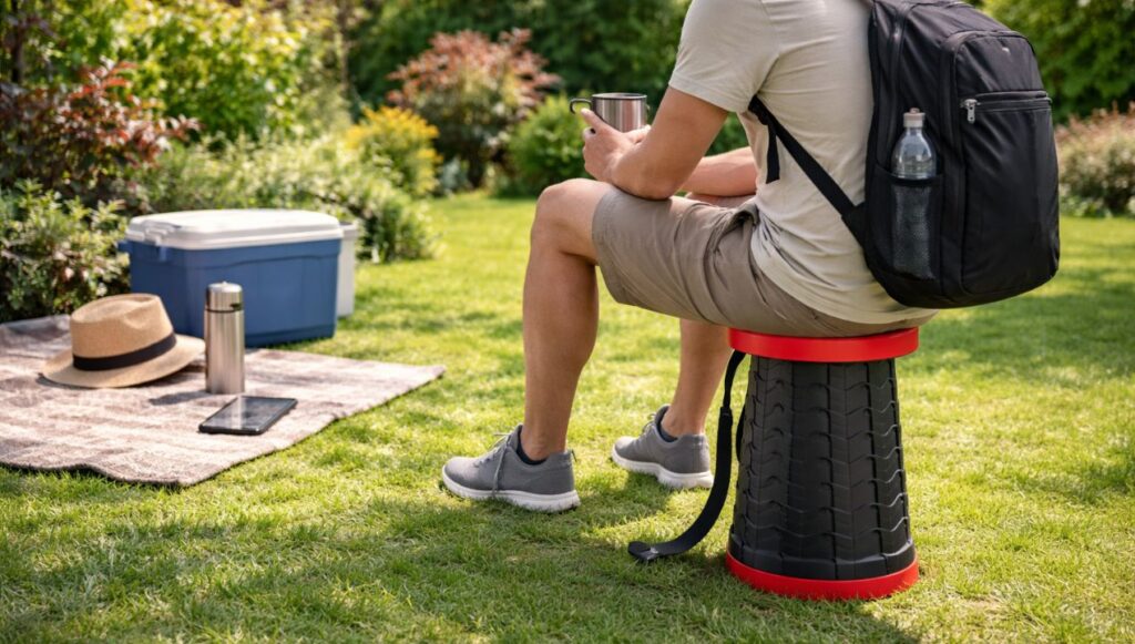 Als je ooit een “handige vouwstoel” hebt gekocht die uiteindelijk toch te groot was om echt mee te nemen… dan snap je meteen waarom dit formaat zo aantrekkelijk is. Deze telescopische kruk is ingeklapt maar 6,5 cm hoog, met een diameter van 26 cm. Dat betekent dat hij gemakkelijk mee kan in een rugzak, sporttas of zelfs onder je arm zonder dat het irritant wordt.