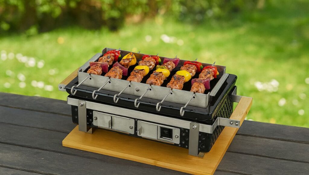 Het opstarten is verrassend ongecompliceerd, zolang je de grill behandelt alsof je een mini-kamado bedient. Een handje kleine houtskool of briketten, aanmaakwokkels ertussen, tien minuutjes geduld, en je ziet de keramiek warm ademen. Dat houten plateau eronder is niet alleen voor de show; het beschermt de tafel tegen de stralingswarmte en houdt de boel stabiel als je aan je spiesen frunnikt. De bijgeleverde rvs-spiesen passen precies over het rooster, waardoor kip, groente of tofu niet door de spijlen kukelt.