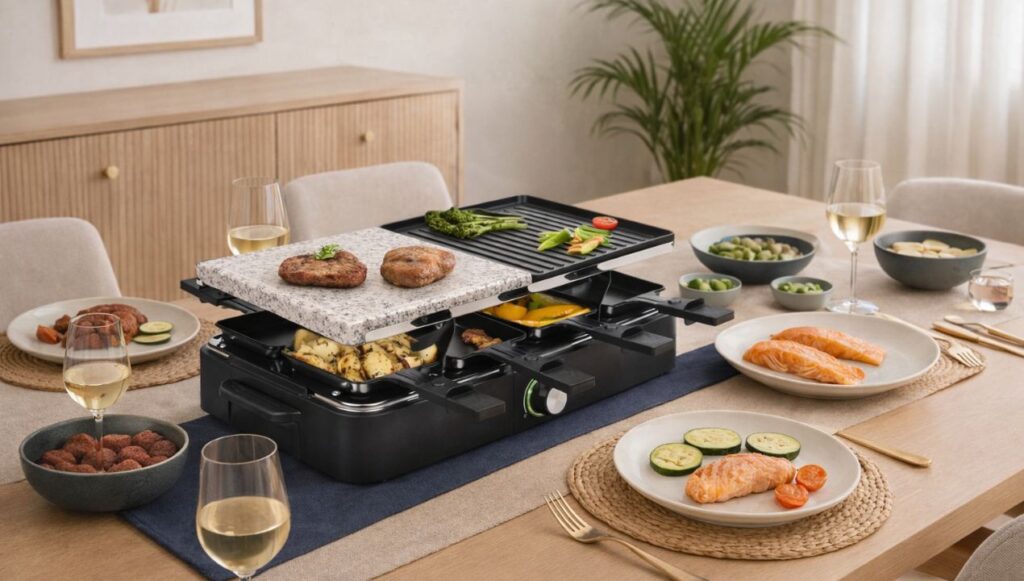 Wat deze set meteen interessant maakt, is dat hij niet alleen raclette is, maar ook gourmetten én steengrillen combineert. Je krijgt dus niet één oppervlak, maar meerdere manieren om je eten klaar te maken. En geloof me: dat klinkt als een detail, maar het maakt echt verschil in hoe leuk (en relaxed) zo’n avond wordt. Zeker als je met een grotere groep bent.