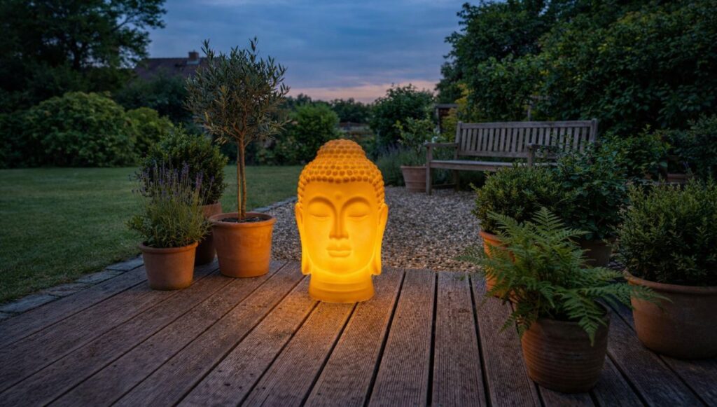 De XXL Buddha solarlamp is veelzijdig inzetbaar en past in vrijwel elke buitenruimte.